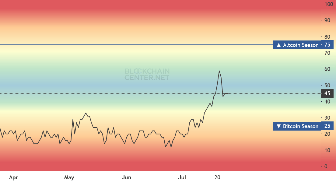 According to data from the Blockchain Center, the altcoin season index is now 45 after bottoming out at 12 in June.